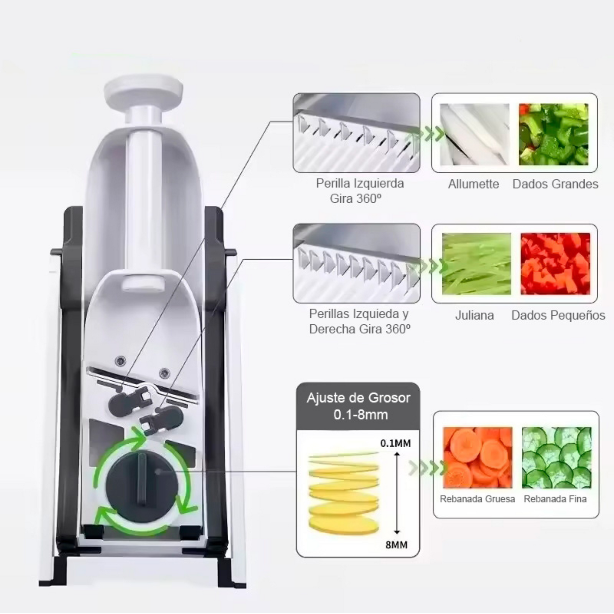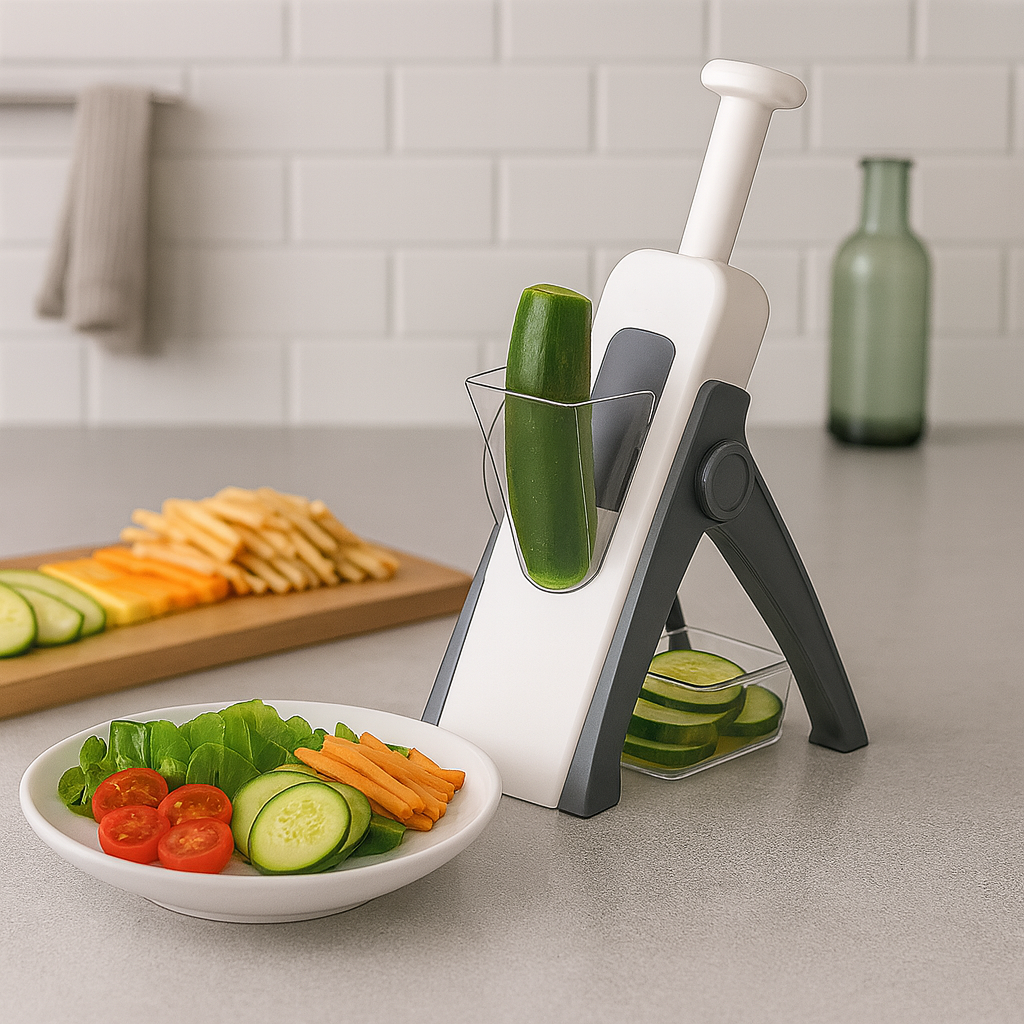 Cortador de frutas y verduras vertical, con multiples usos, perfecto para cortar, rallar hacer dados o cualquier otro tipo de corte.